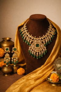 Heritage-inspired necklaces, antique-finish bangles, temple-style motifs, and intricate craftsmanship remain essential for moments that call for grandeur. These designs reflect cultural roots and showcase the enduring value of traditional artistry.